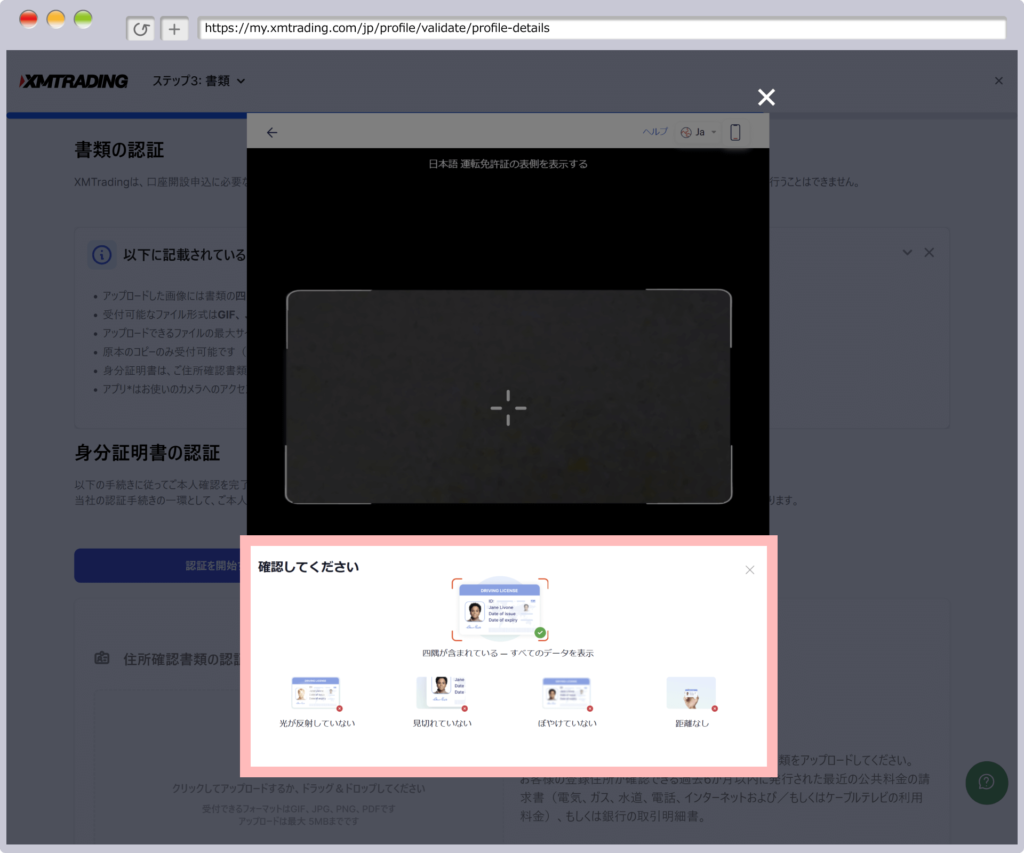 撮影方法の確認画面が表示されますので、確認の上、確認画面右上の「×」をクリックして撮影に進みます。書類の四隅が含まれていない場合や不鮮明の場合は正常に認証されないので注意してください。